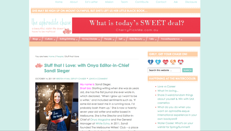 Thanks to the team over at Chasing Aphrodite for featuring me in their ‘Stuff That I Love’ section a couple of weeks ago.